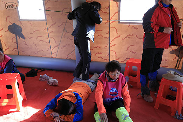 傍晚達到營地,每個人都風(fēng)塵仆仆,脫下襪子腳腫了一圈,有的襪子被血水模糊了,撕下來淚水隱忍而出。看著周邊的同伴,原以為她自己情況是最慘的,但不知團隊里有人原本就膝蓋痛,有的人發(fā)燒,有的人也來例假,有的人近240斤仍不懈前行,有的人比自己還要高齡也不放棄。