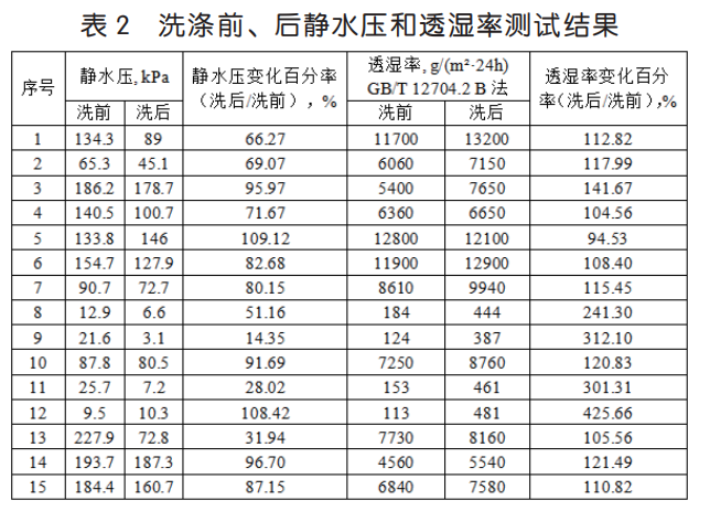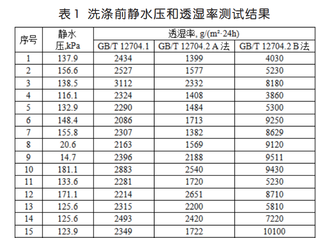以筆者所在的檢測機構為例,收集了一定時間內的沖鋒衣面料檢測樣品,共計 50 個,其中 35 個樣品采用上述方法,進行靜水壓和透濕率測試,研究不同方法之間的關系,結果見表 1。15 個樣品按照GB/T 32614-2016《戶外運動服裝 沖鋒衣》測試比較樣品洗滌前、后的靜水壓和透濕率變化,結果見表 2。