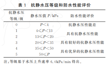 靜態(tài)防水性能是指沖鋒衣抵御雨水浸濕滲透的能力。這是沖鋒衣最基礎的功能,可以有效防止雨雪浸入衣服。這一項可以通過量化實驗檢查——對織物一面施加一個持續(xù)上升的水柱,直到另一面出現三處滲水點,此時去水柱水壓值。抗靜水壓等級和防水性能評價表見下圖