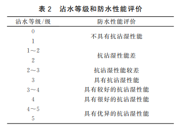 另外還有沾水等級檢測。沾水等級是指沖鋒衣面料表面抵御羽絨潤濕的能力。具體檢驗方式是取一定量的水噴淋檢驗,通過觀察對比確定面料的沾水等級。沾水等級以及防水性能評價表見下圖: