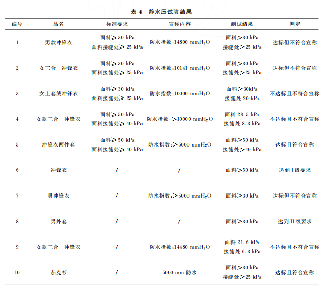 本文最終的判定是結(jié)合 GB/T32614—2016《戶外運(yùn)動服裝 沖鋒衣》中面料功能性要求和產(chǎn)品銷售時的吊牌宣稱進(jìn)行。達(dá)標(biāo)是指符合沖鋒衣的合格品 標(biāo) 準(zhǔn) 要 求,反 之 則 不 符 合。10 件 樣 品中,只有5件達(dá)標(biāo),且只有3件是符合吊牌宣稱內(nèi)容。其中,標(biāo)示了 GB/T32614—2016的沖鋒衣,有3件達(dá)標(biāo),合格率為60%。近年來,監(jiān)管部門的抽查合格率一般在80%左右。這次比較試驗(yàn)合格率偏低的原因可能是樣品量較少,樣品的價格區(qū)間比較集中,且考核了接縫處的靜水壓。值得注意的是有2件沒有標(biāo)示 GB/T32614—2016的外套,其性能都符合標(biāo)準(zhǔn)要求。此外,銷售方對靜水壓的宣稱都偏高,有3件達(dá)標(biāo)了卻不符合自身的宣稱內(nèi)容。沖鋒衣 GB/T32614—2016標(biāo)準(zhǔn) 中 I級 對 靜 水 壓 的 要 求 也 只是:面料≥50kPa和面料接縫處≥50kPa,銷售 方卻往往宣稱100kPa,甚至達(dá)150kPa,而且也沒有充分考慮到面料接縫處靜水壓值會相對偏小的現(xiàn)實(shí)。需要警 醒 的 是,5 件 標(biāo) 示 了 GB/T32614—2016的沖鋒衣其綜合宣傳都不符合規(guī)定,存在執(zhí)行標(biāo)準(zhǔn)標(biāo)注正確卻夸大宣傳的嫌疑。