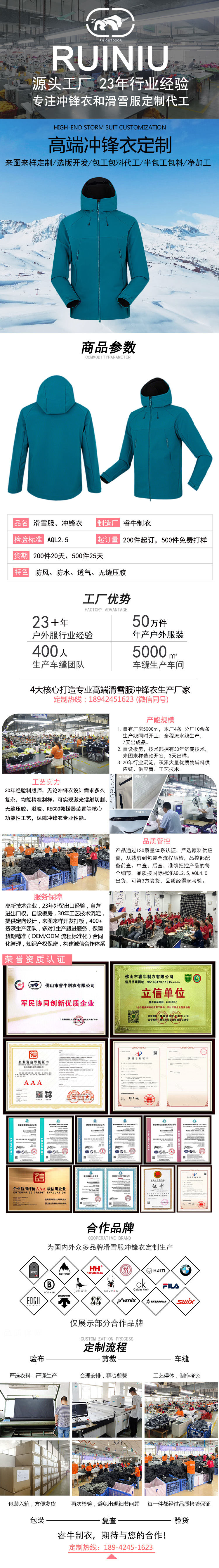 防水拉鏈:整件沖鋒衣的拉鏈均采用防水壓膠拉鏈,亦可根據(jù)客戶要求定制。