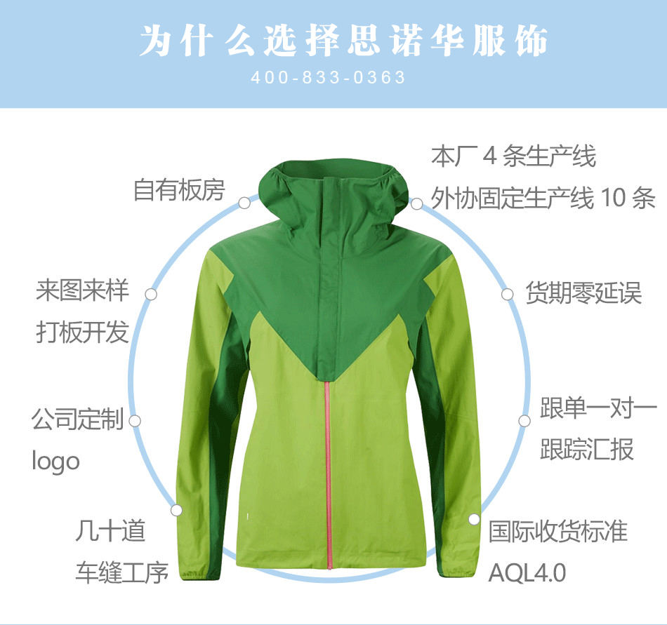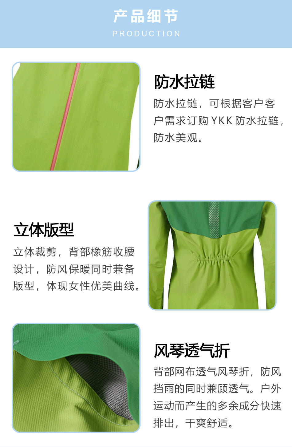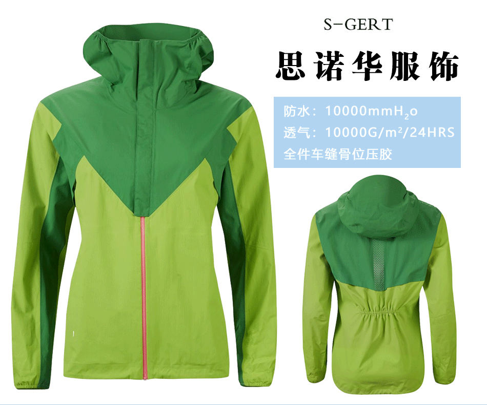 立體版型:后背收腰設計,立體裁剪,防風保暖同時兼?zhèn)浒嫘停w現(xiàn)女性優(yōu)美曲線,專業(yè)單層壓膠衣定制。