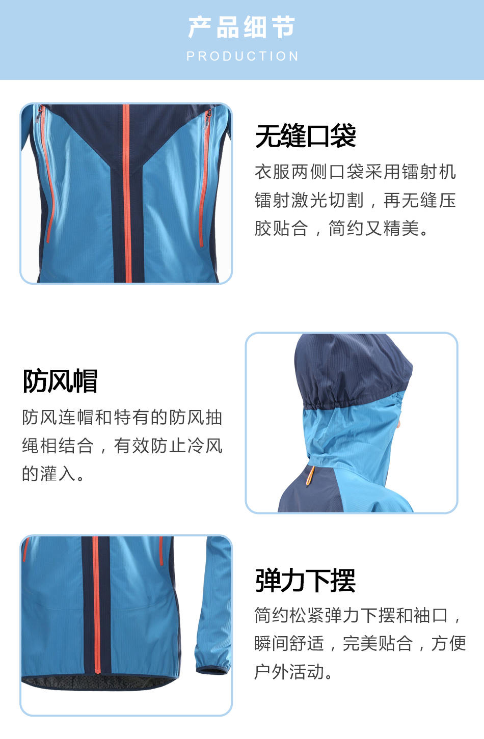 無縫口袋:衣服兩側口袋采用鐳射機鐳射激光切割,再無縫壓膠貼合,簡約又精美。